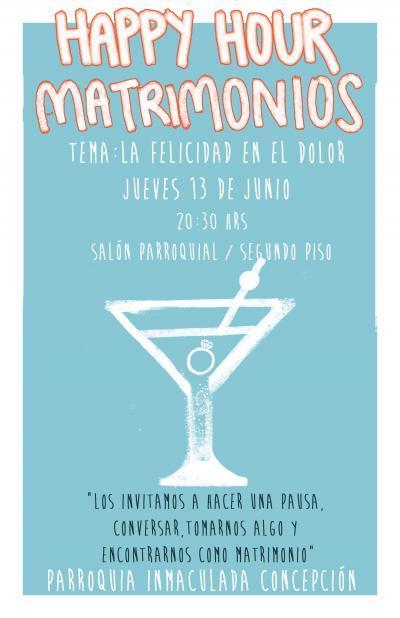 La pastoral de matrimonios jóvenes invita a todos los esposos a participar de su encuentro "Happy hour matrimonios" el próximo jueves 13 de junio a las 20:30 hrs. en el salón parroquial.