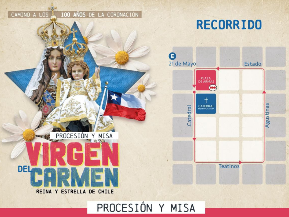 Alentados por el lema "Virgen del Carmen, Renueva de Esperanza a Chile", nos reuniremos a las 15:00 horas en Plaza de Armas para ir en procesión por las calles del centro de Santiago acompañando a nuestra Reina, Patrona y Generala de las Fuerzas Armadas y del Orden.