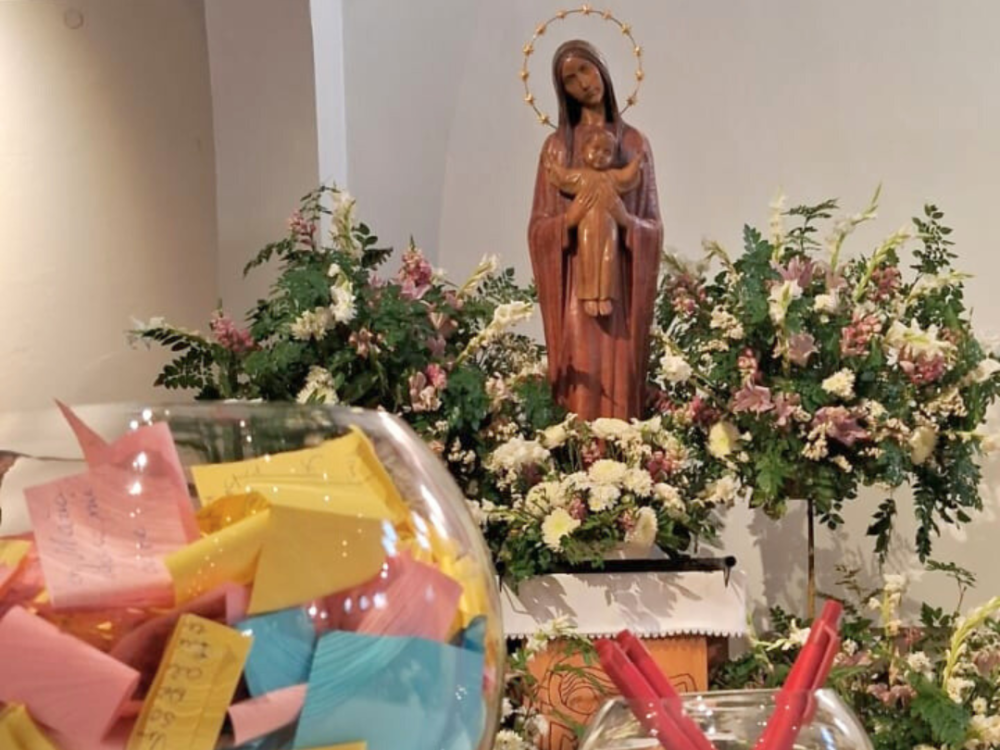 La “Pecera”: papel y lápiz están disponibles a un costado del altar para dejar tus intenciones, agradecimientos y súplicas a los pies de la Virgen.